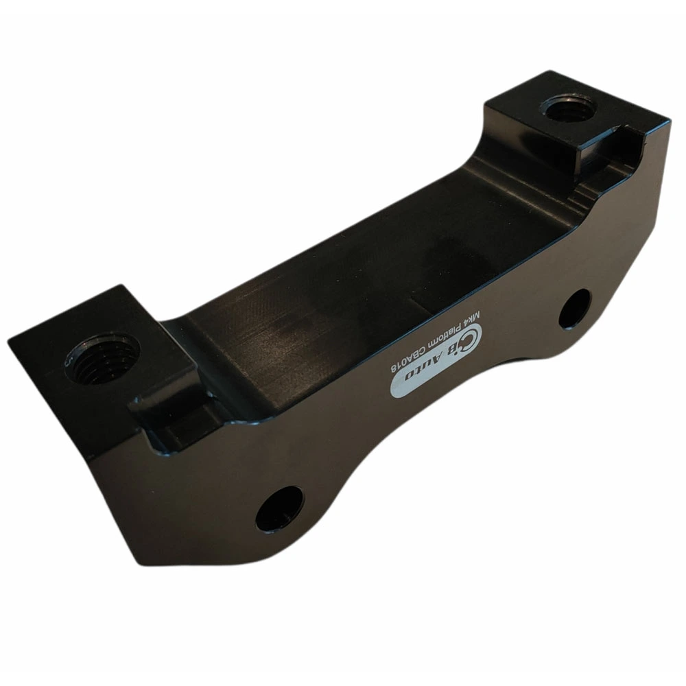 A pair of precision CNC machined 6082-T6 alloy adaptors to allow the fitting of the Renault Megane RS III Brembo caliper to the Mk4 Golf VAG platform based around a 330x28mm Alfa Brera V6 disk which is easily sourced. Fully anodised to protect them from the harsh conditions of UK winter roads.